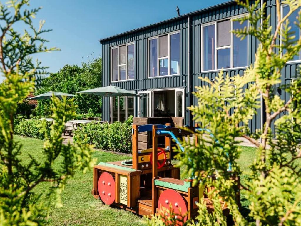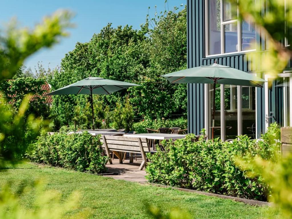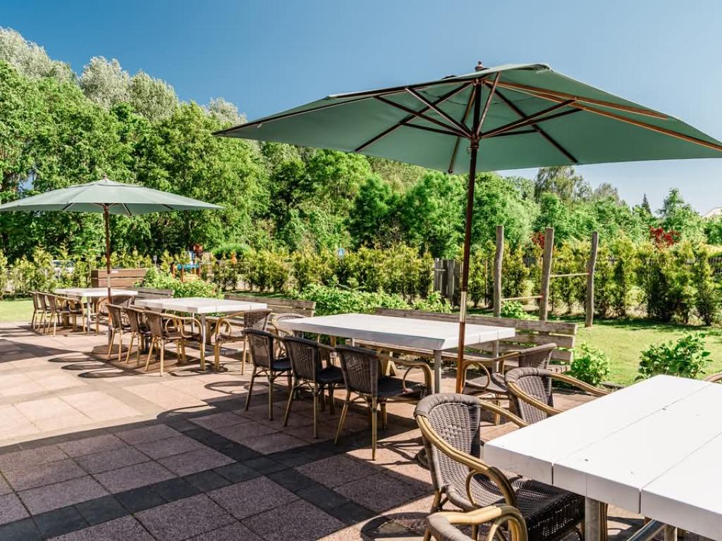 De accommodatie beschikt over een ruim, omheind terras met tuin, ideaal voor groepen die graag buiten samenkomen. De ligging op het oosten en zuiden zorgt voor veel zonuren. Terwijl u geniet van een kop koffie of een goed gesprek, kunnen de kinderen veilig spelen binnen de omheining.